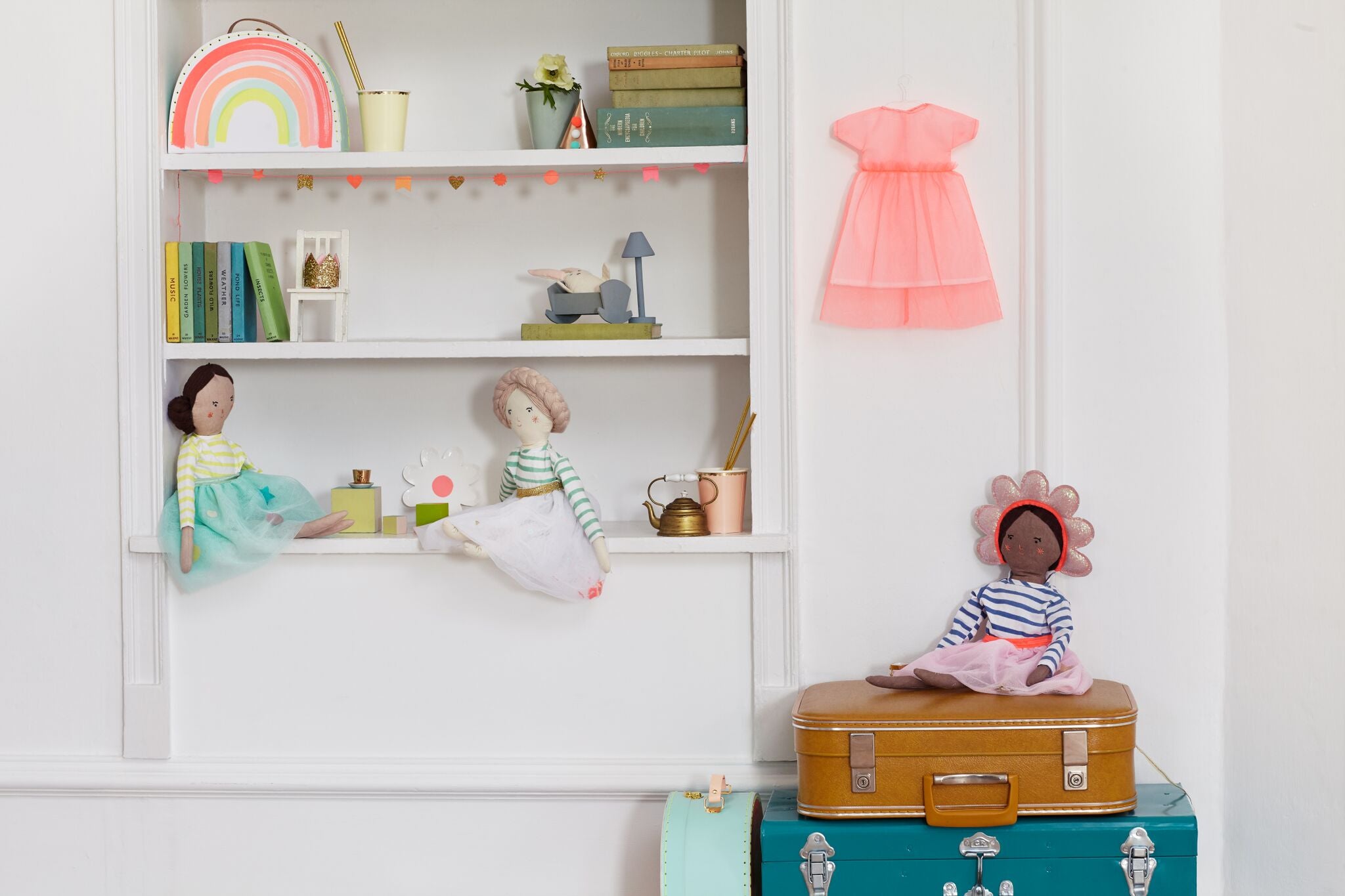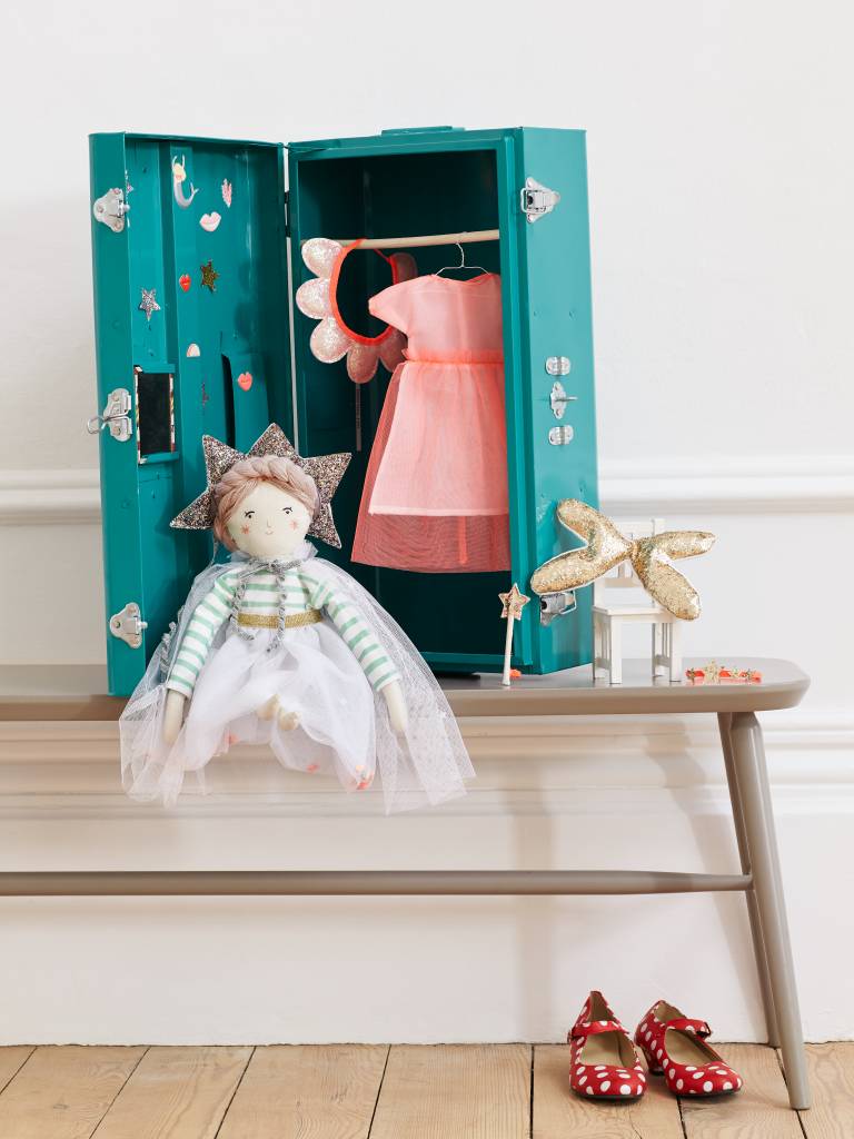 Esta es Matilda, confeccionada en algodón con pelo de lana trenzada y rasgos bordados. Lleva una camiseta a rayas en verde y blanco y una falda tutú con confetti. Puedes cambiarle las ropitas por cualquiera de los los juegos de ropa que se venden por separado, disfraces y pijamas.